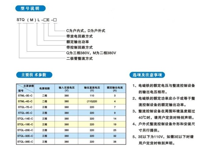 STQ(M)L系列產品具有九十年代國內先進水平。該系列產品經變壓器通過三相橋式整流組件,從交流電源獲得直流220伏電壓,整個設備又自動空氣開關、變壓器、二相或三相橋式整流組件、直流接觸器等主要部件組成。電路設置有短路、過電壓等保護措施,當受控電磁鐵容量大于19千瓦時,整流變壓器外附;當受控電磁鐵容量小于或等于14千瓦時,采用單相橋式整流方式。本產品由www.dyjy8.cn提供