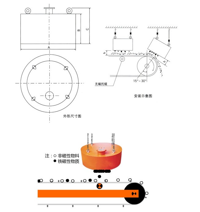 本系列除鐵器為長期工作制的電磁除鐵器,配有三組可調(diào)掛鉤,能方便的調(diào)整 架設(shè)高度和安裝高度。適合于從較厚料層和較大粒度煤炭、焦碳、礦石、石灰 石、碎石、谷類、刨木花等原料中除去鐵磁性異物。
